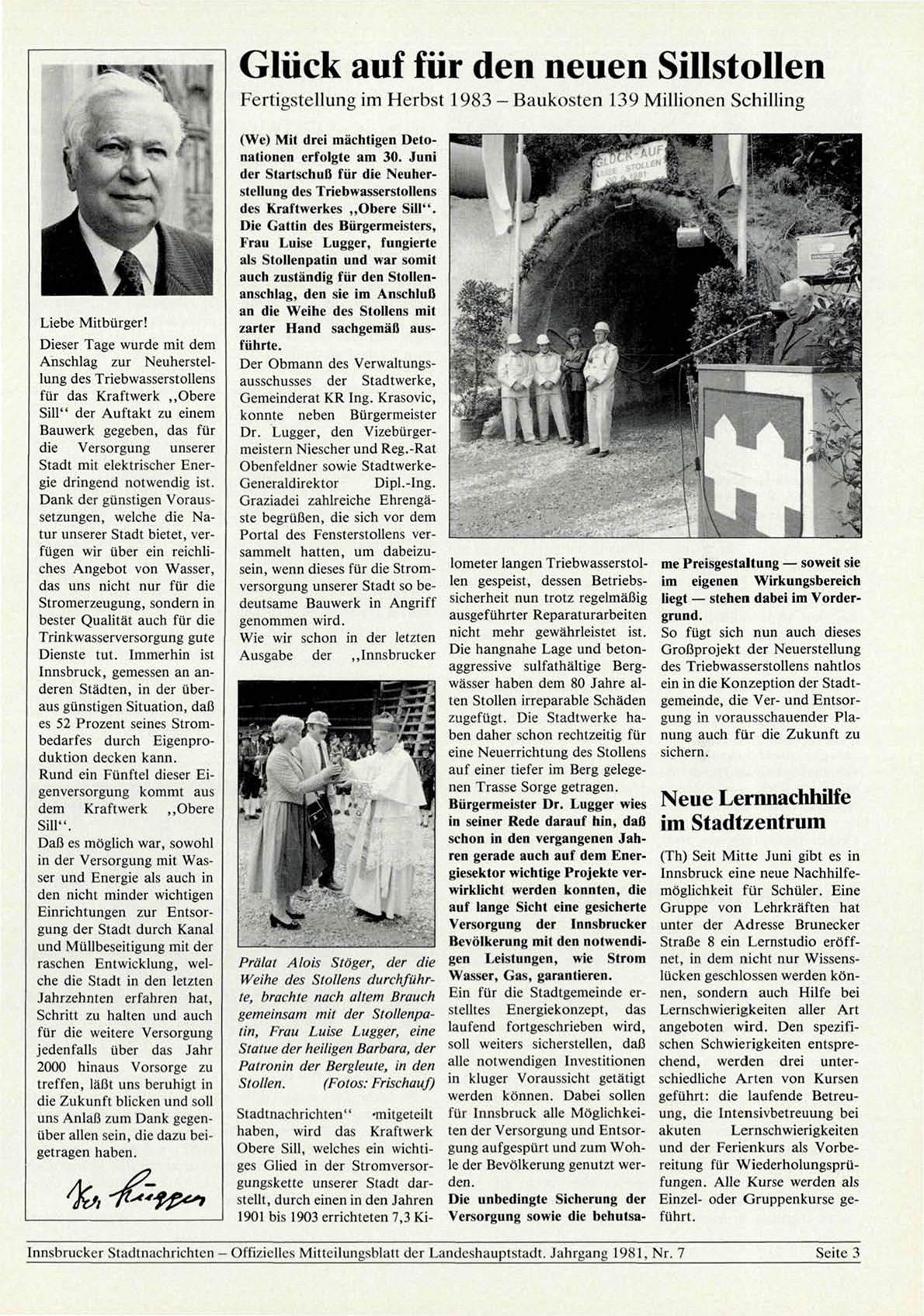 für Innsbruck alle MöglichkeiStadtnachrichten" -mitgeteilt ten der Versorgung und Entsorhaben, wird das Kraftwerk gung aufgespürt und zum WohObere Sill, welches ein wichti- le der Bevölkerung genutzt werges Glied in der Stromversor- den.