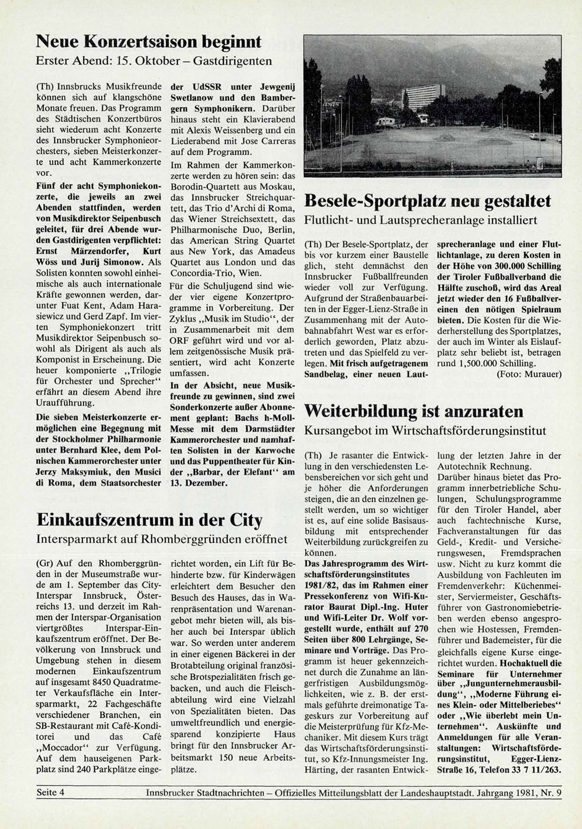 Innsbrucker Stadtnachrichten — Offizielles Mitteilungsblatt der Landeshauptstadt. Jahrgang 1981, Nr. 9