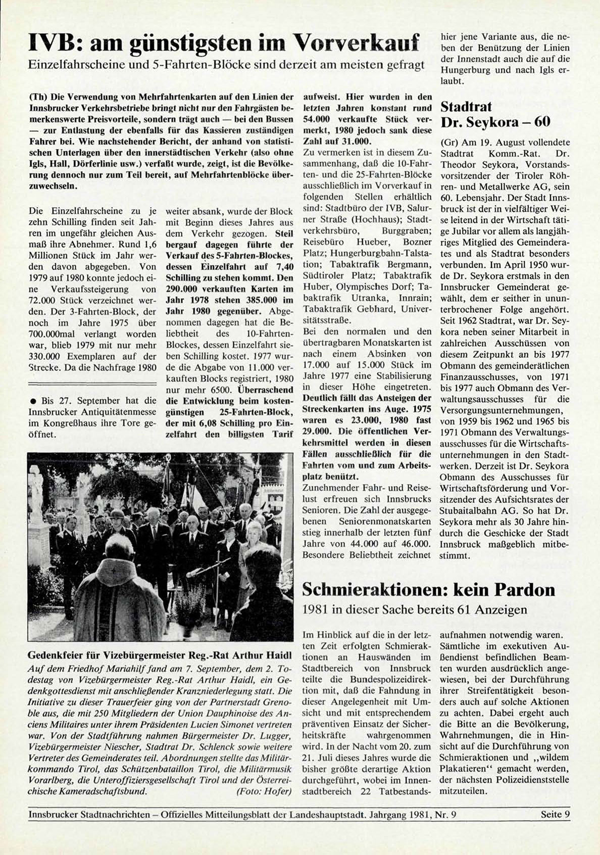 Innsbrucker Stadtnachrichten - Offizielles Mitteilungsblatt der Landeshauptstadt. Jahrgang 1981, Nr. 9