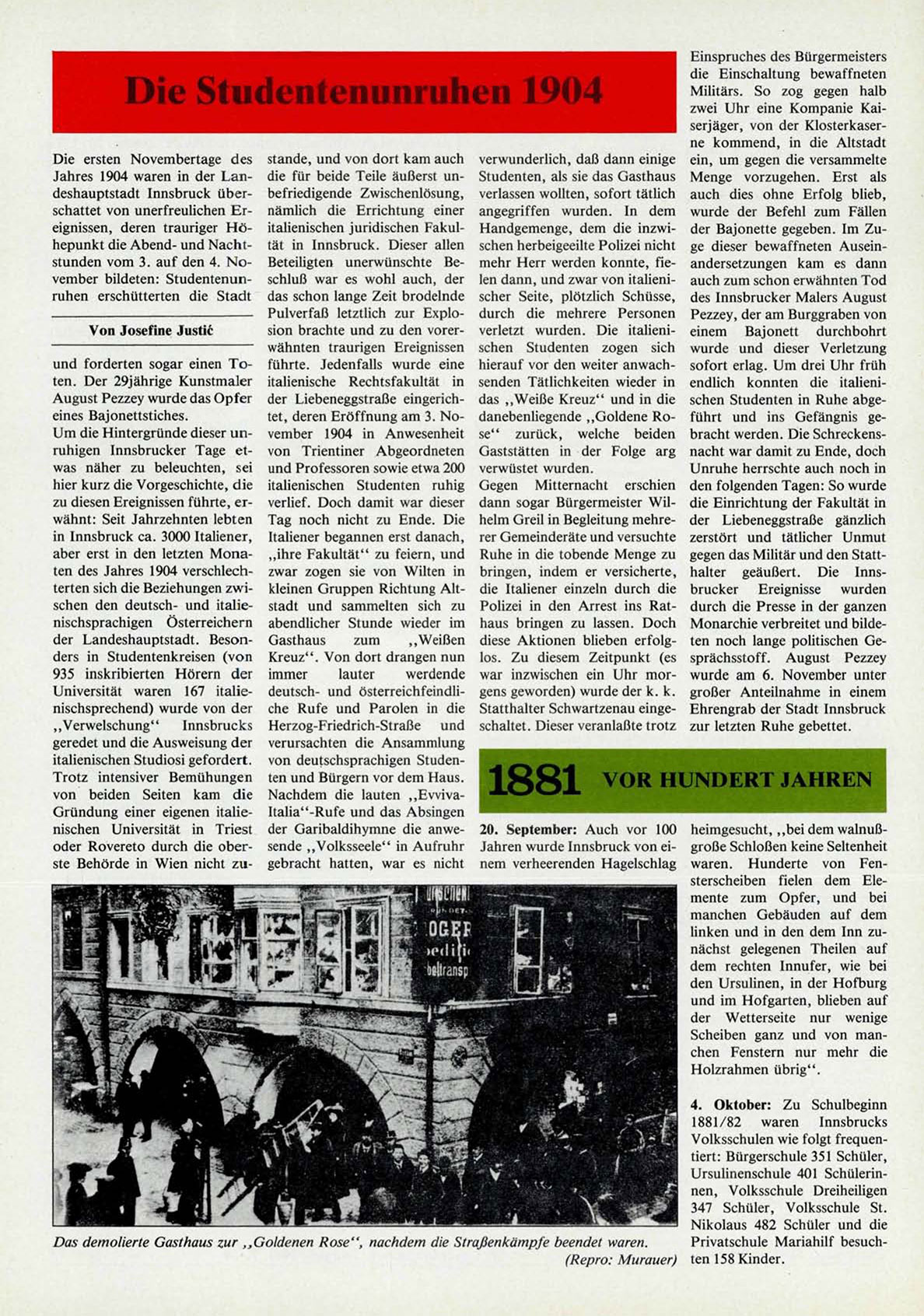 Jahres 1904 waren in der Landeshauptstadt Innsbruck überschattet von unerfreulichen Ereignissen, deren trauriger Höhepunkt die Abend- und Nachtstunden vom 3. auf den 4. November bildeten: Studentenunruhen erschütterten die Stadt