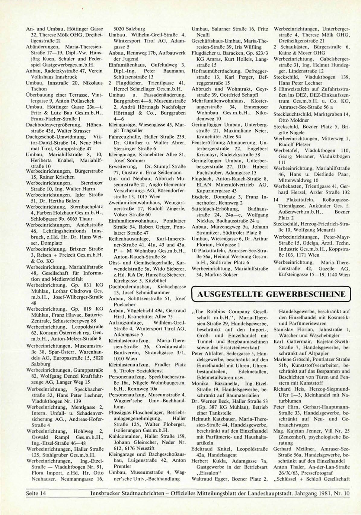 Innsbiueker Stadtnachrichten - Offizielles Mitteilungsblatt der Landeshauptstadt. Jahrgang 1981, Nr. 10