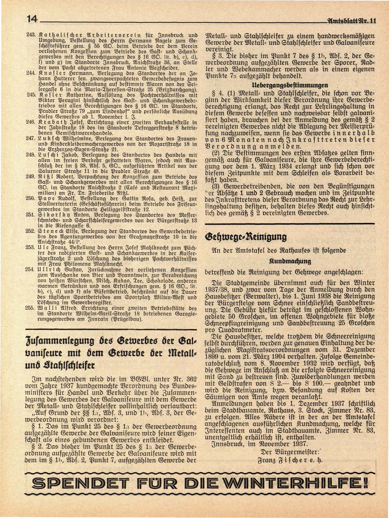 vom Jahre 1937 kundgemachte Verordnung des Vundesministers für Handel und Verkehr über die Zusammenlegung des Gewerbes der Galvaniseure mit dem Gewerbe
