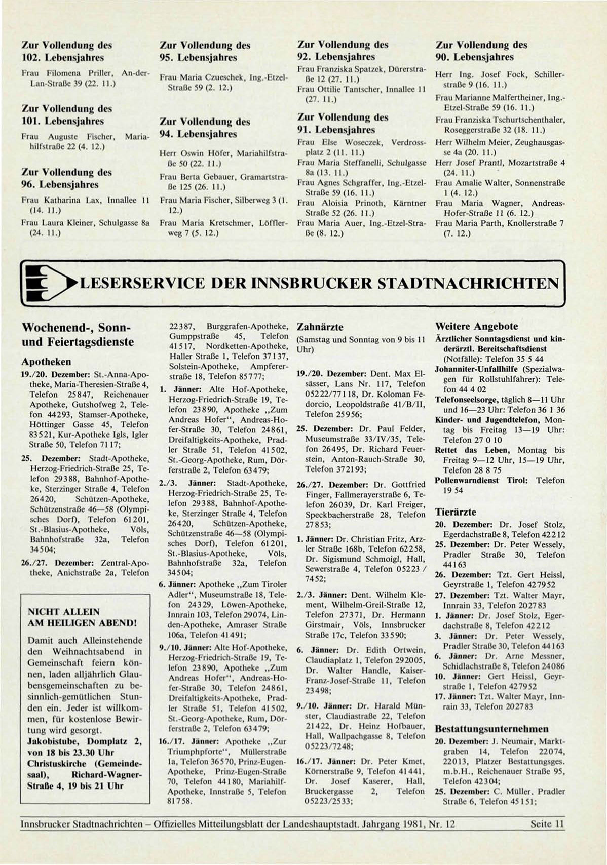 Andreas Hofer", Andreas-Hofer-Straße 30, Telefon 24861, 25. Dezember: Dr. Paul Felder,