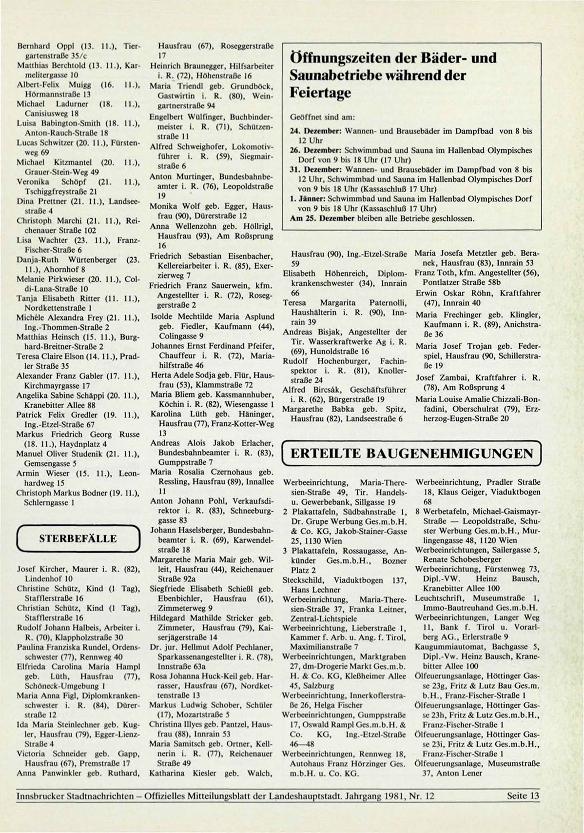 Innsbrucker Stadtnachrichten - Offizielles Mitteilungsblatt der Landeshauptstadt. Jahrgang 1981, Nr. 12
