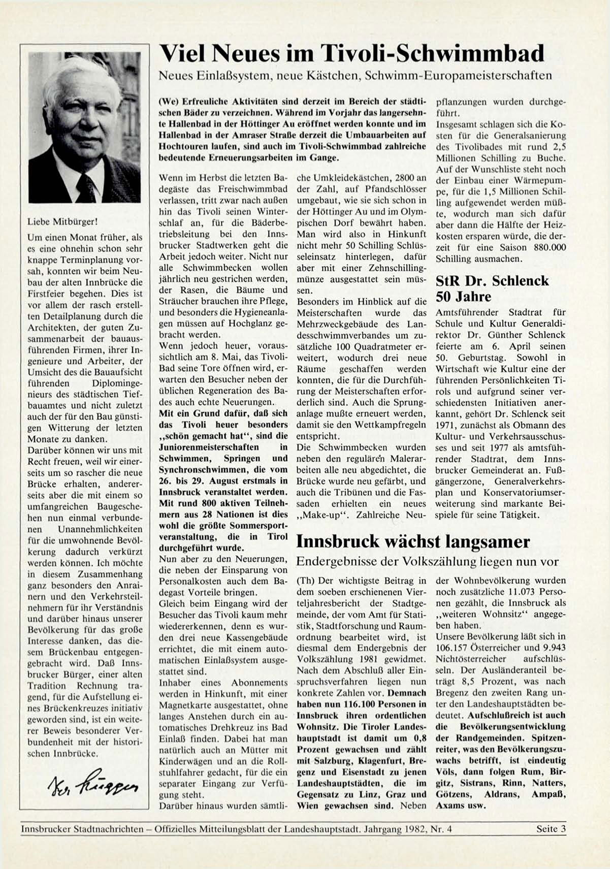 Innsbrucker Stadtnachrichten - O f f i z i e l l e s Mitteilungsblatt der Landeshauptstadt. Jahrgang 1982, N r . 4