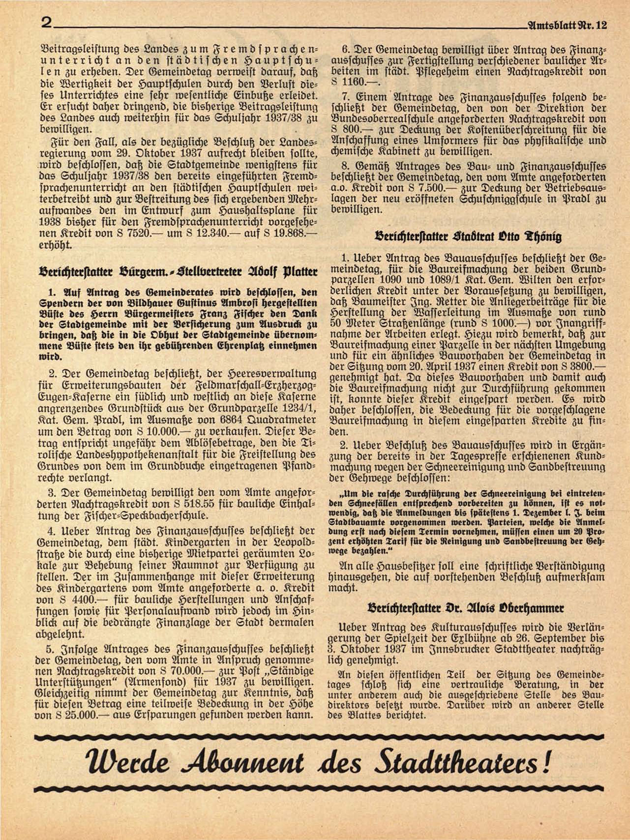 5. Infolge Antrages des Finanzausschusses beschließt 3. Oktober 1937 im Innsbrucker Stadttheater nachträgder Gemeindetag, den vom Amte in Anspruch genomme- lich genehmigt.