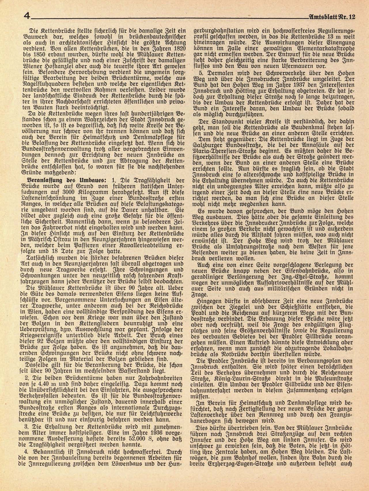 Da die Kettenbrücke wegen ihres fast hundertjährigen Bestandes schon zu einem Wahrzeichen der Stadt Innsbruck geworden ist, so ist es begreiflich, daß sich weite Kreise der Bevölkerung nur schwer von ihr trennen können und daß sich