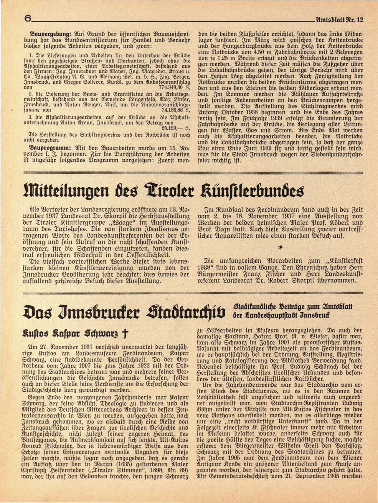 kam also Schwarz im Jahre 1901 als provisorischer KustosAm 27. November 1937 verschied unerwartet der langjäh- Adjunkt mit halbtägiger Arbeitszeit an das Ferdinandeum,