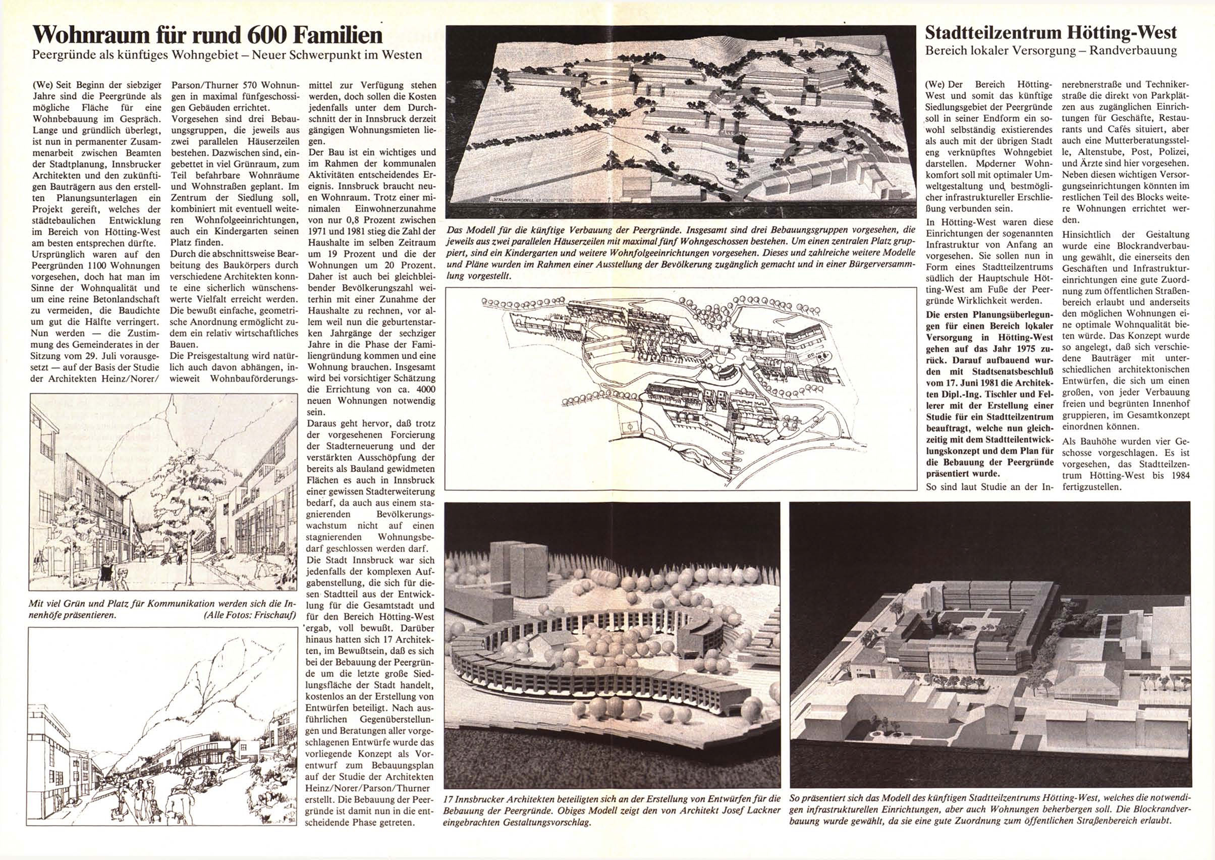 17 Innsbrucker Architekten beteiligten sich an der Erstellung von Entwürfen für die So präsentiert sich das Modell des künftigen Stadtteilzentrums Hötting- West, welches die notwendiBebauung der Peergründe. Obiges Modell zeigt den von Architekt Josef Lackner gen infrastrukturellen Einrichtungen, aber auch Wohnungen beherbergen soll. Die Blockrandverbauung wurde gewählt, da sie eine gute Zuordnung zum öffentlichen Straßenbereich erlaubt.
