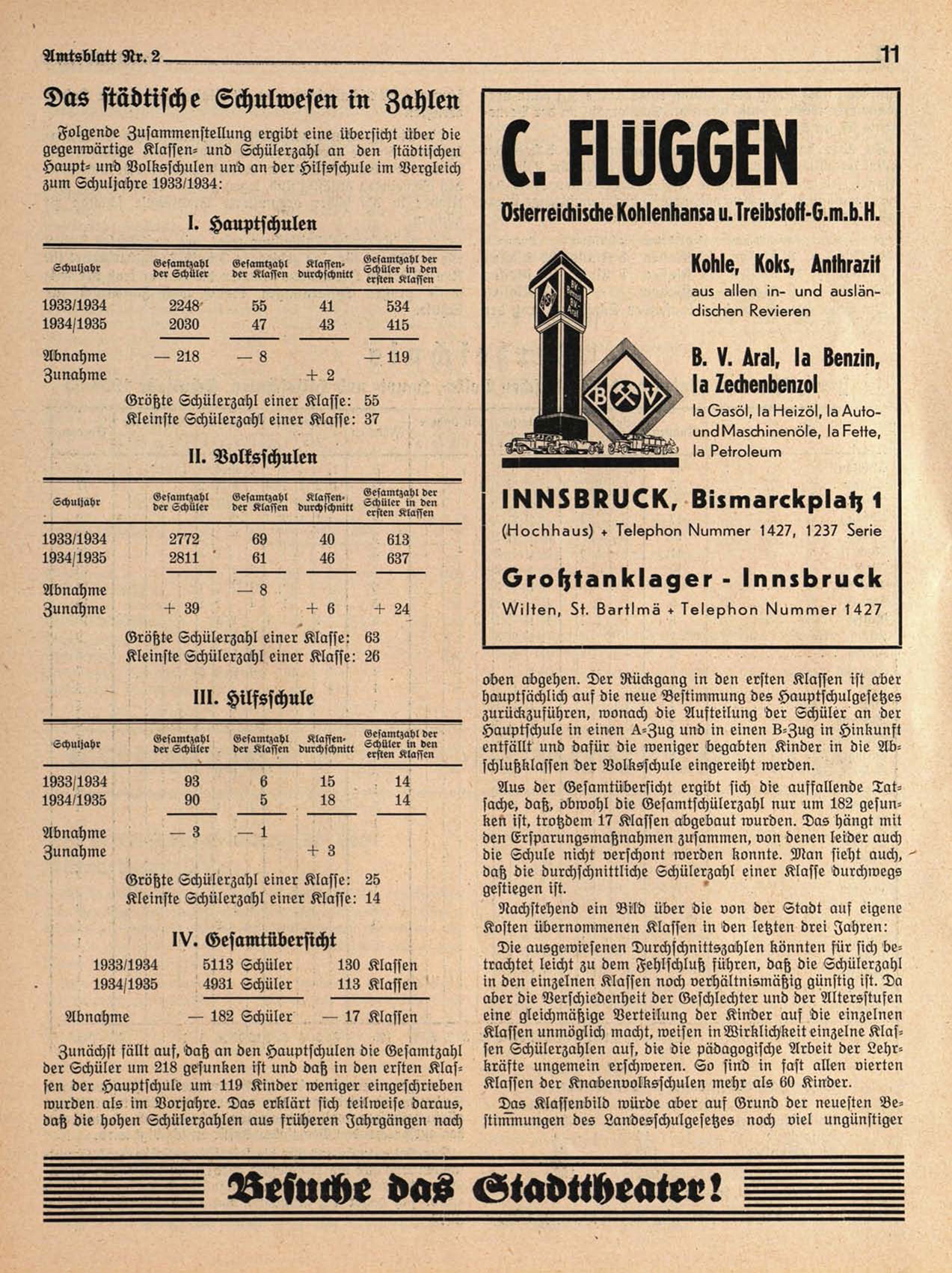 Aus der Gesamtübersicht ergibt sich die auffallende Tatsache, daß, obwohl die Gesamtschülerzahl nur um 182 gesunken ist, trotzdem 17 Klassen abgebaut wurden. Das hängt mit