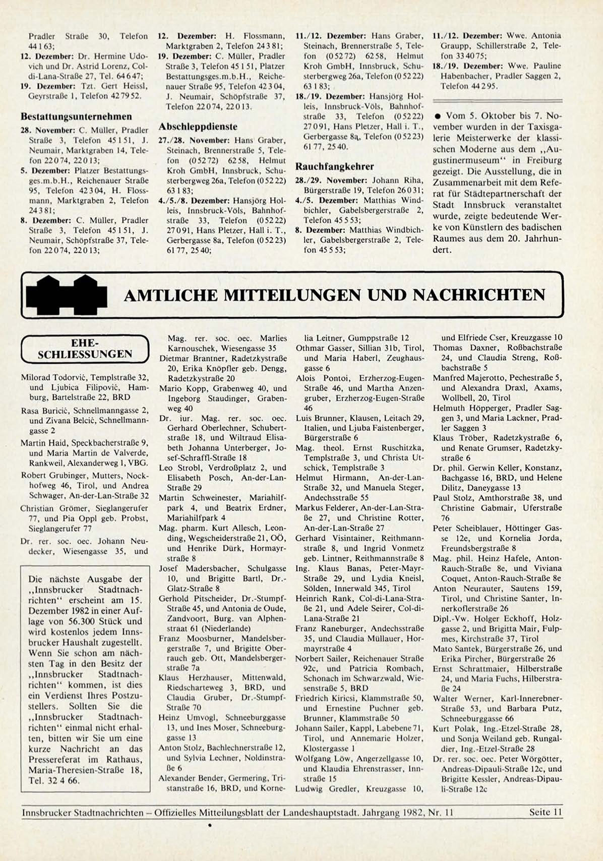 I n n s b r u c k e r S t a d t n a c h r i c h t e n - O f f i z i e l l e s M i t t e i l u n g s b l a t t d e r L a n d e s h a u p t s t a d t . J a h r g a n g 1982, N r . 1 1