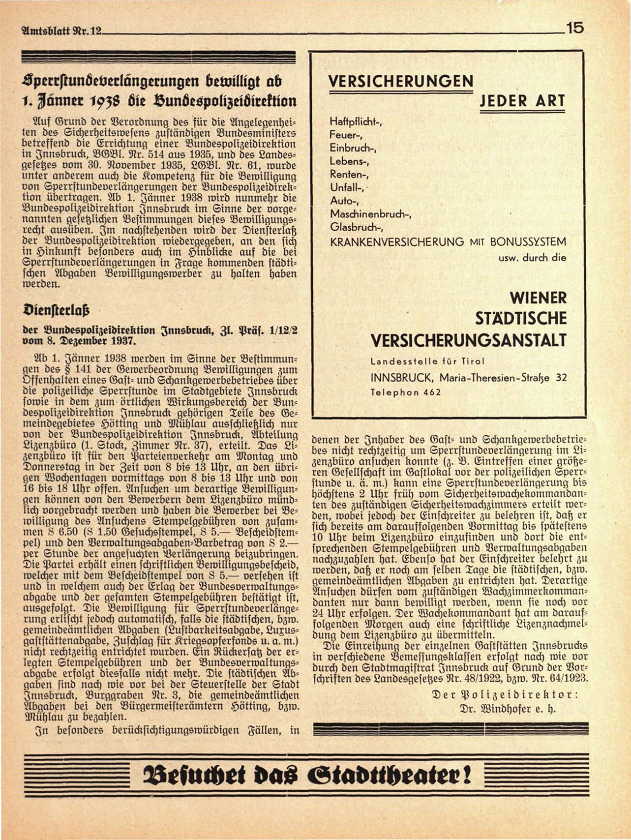 von Sperrstundeverlängerungen der Vundesvolizeidirektion übertragen. Ab 1. Jänner 1938 wird nunmehr die