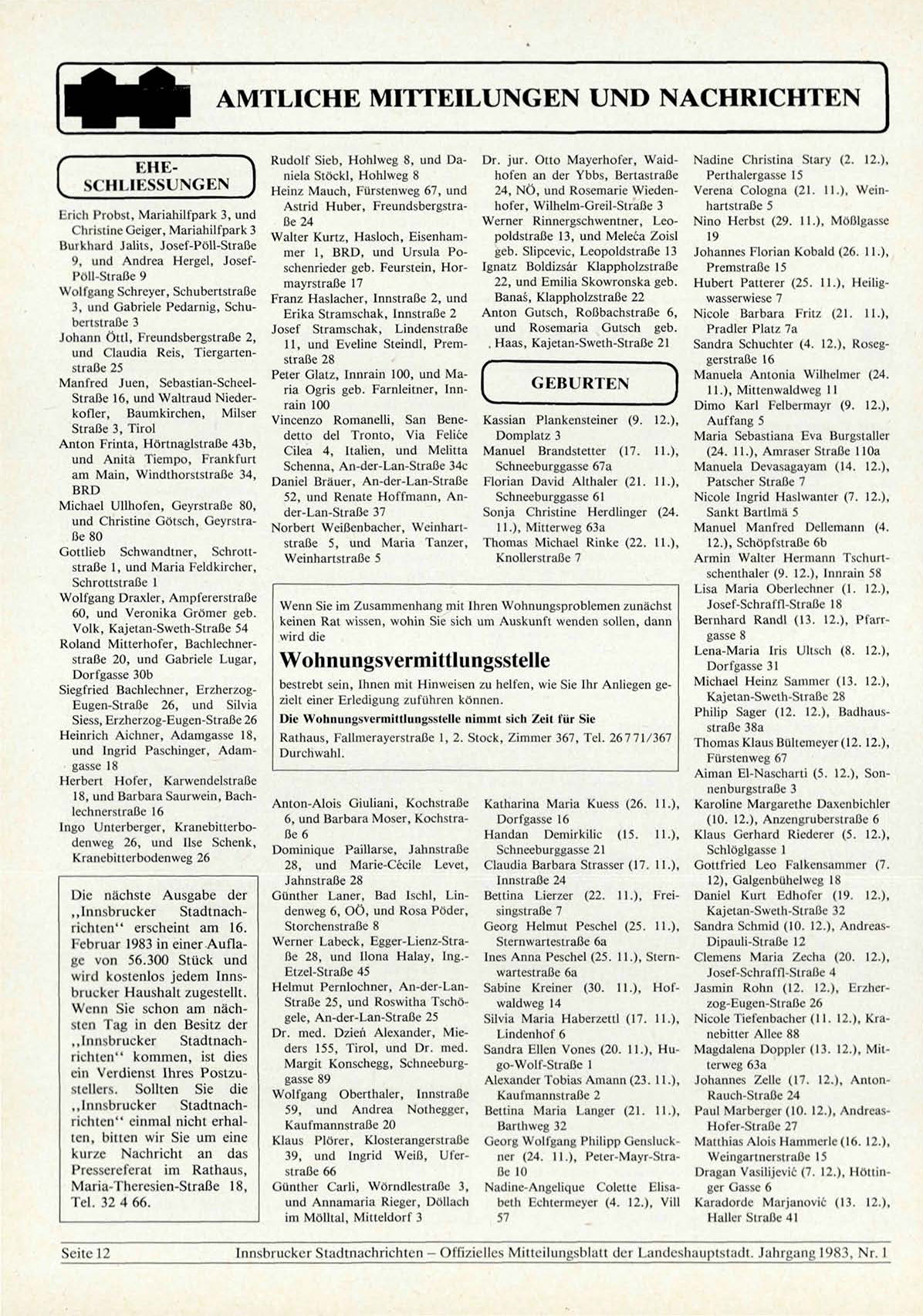 Innsbrucker Stadtnachrichten - Offizielles Mitteilungsblatt der Landeshauptstadt. Jahrgang 1983, Nr. 1