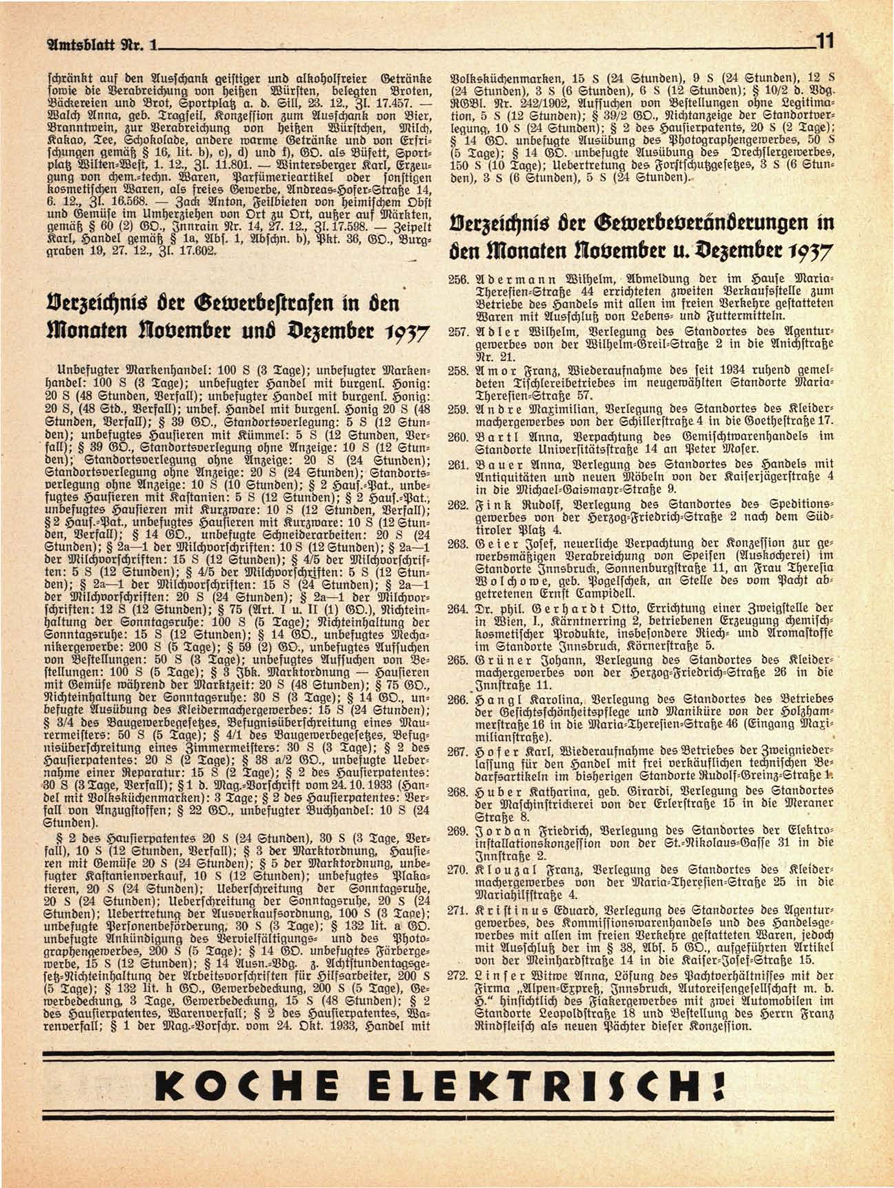 30 8 (3Tage, Verfall); §1 d. Mag.-Vorschrift vom24.10.1933 (Handel mit Volksküchenmarken): 3 Tage; § 2 des Hausierpatentes: Versall von Anzugstoffen; § 22 GO., unbefugter Buchhandel: 10 8 (24