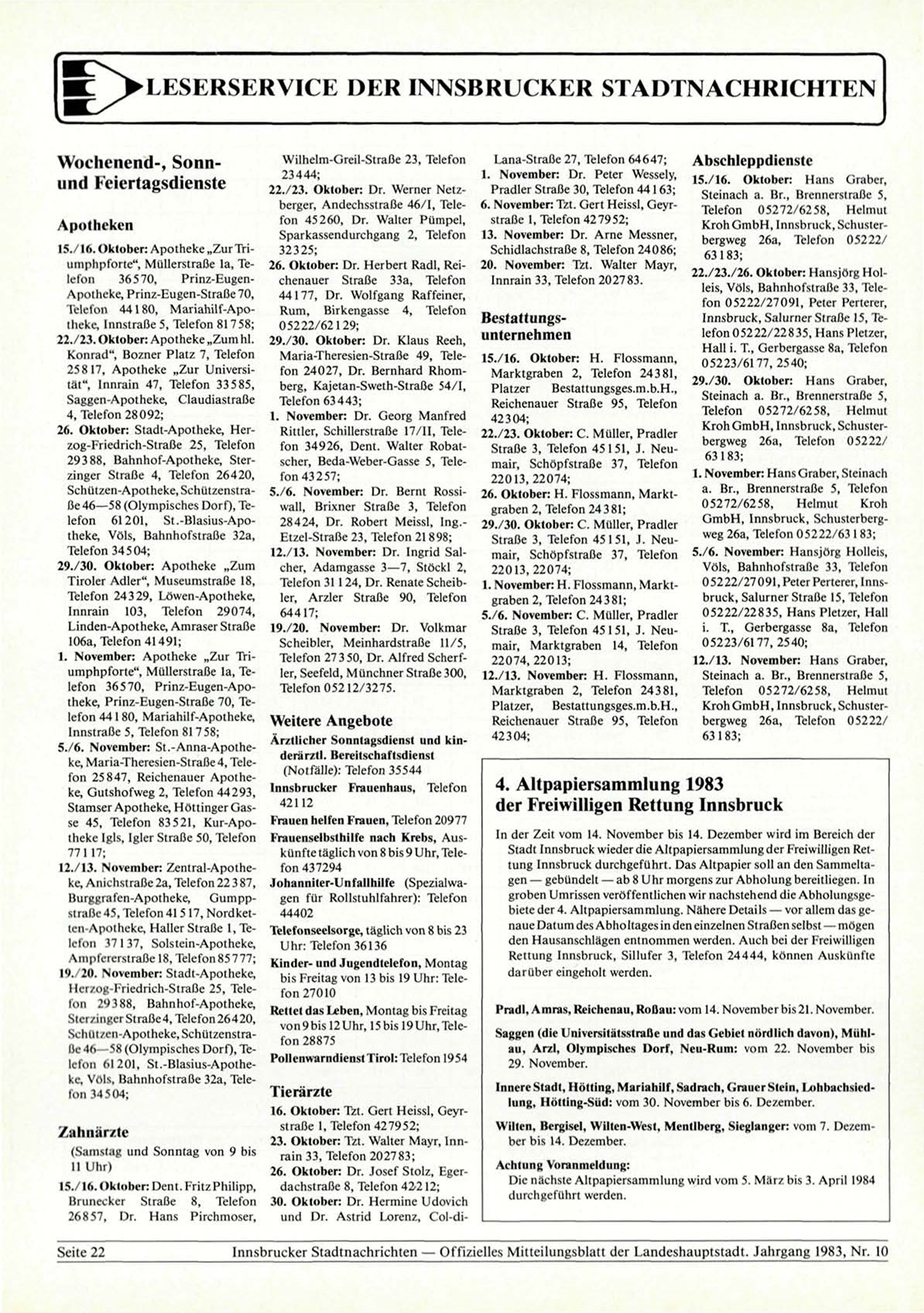 Innsbrucker Stadtnachrichten — Offizielles Mitteilungsblatt der Landeshauptstadt. Jahrgang 1983, Nr. 10
