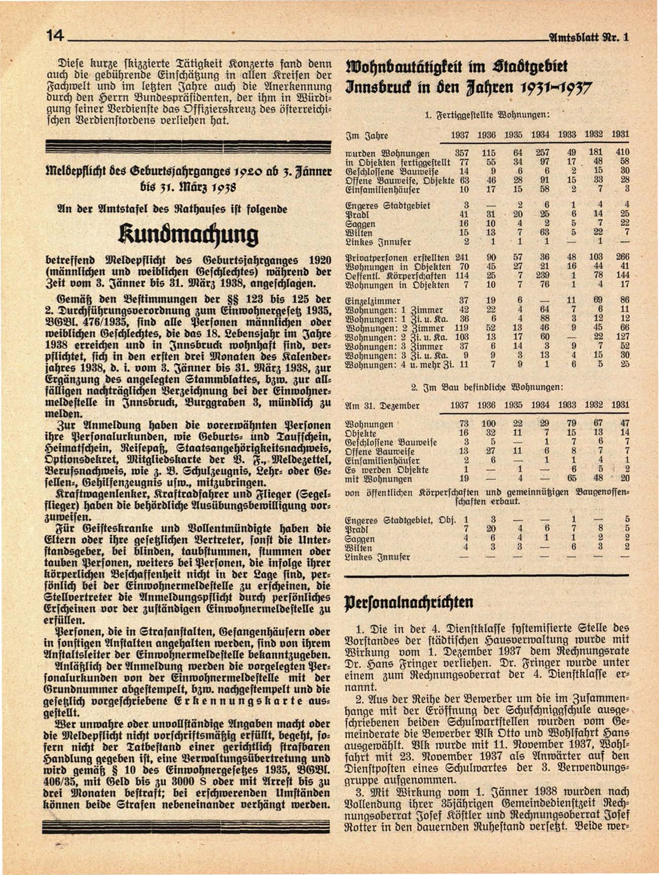 1938 erreichen und in Innsbruck wohnhaft find, verpflichtet, sich in den ersten drei Monaten des Kalenderjahres 1938, d. i. vom 3. Jänner bis 31. März 1938. zur