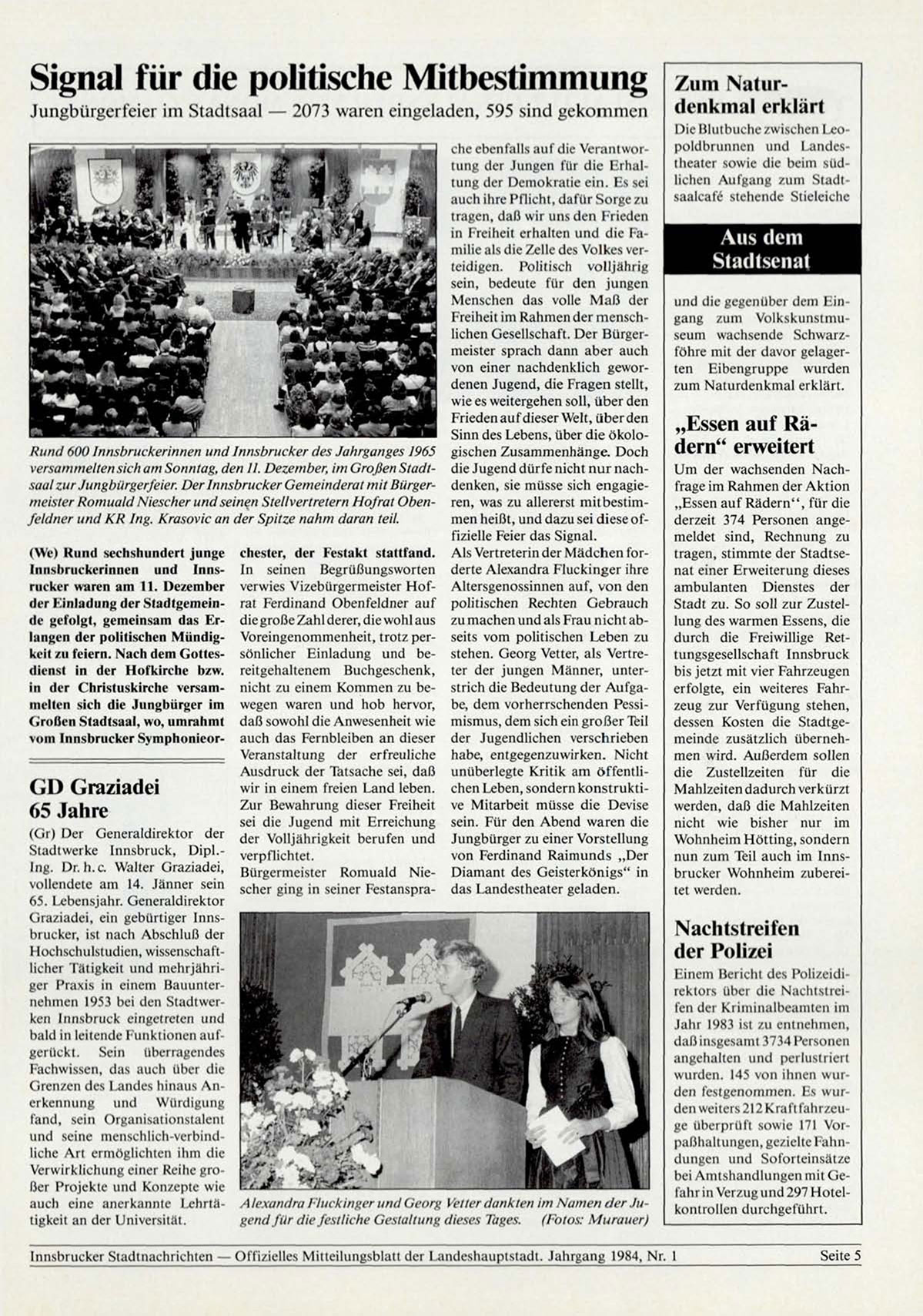 I n n s b r u c k e r S t a d t n a c h r i c h t e n — O f f i z i e l l e s M i t t e i l u n g s b l a t t der L a n d e s h a u p t s t a d t . J a h r g a n g 1984, N r . 1