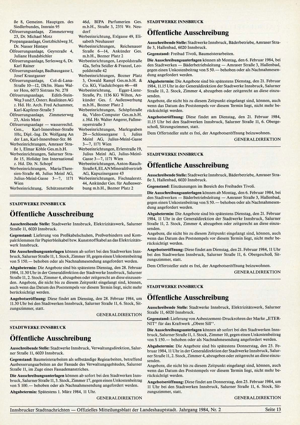 Abgabetermin: Die Angebote sind bis spätestens Donnerstag, den 23. Februar 1984,11 U h r in der Generaldirektion der Stadtwerke Innsbruck, Salurner Straße 11,2. Stock, Zimmer 4, abzugeben oder zeitgerecht an diese einzusenden.