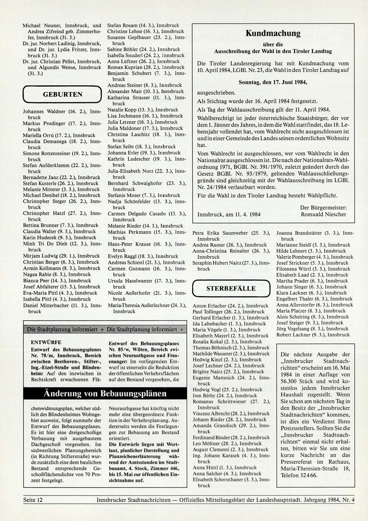 Innsbrucker Stadtnachrichten — Offizielles Mitteilungsblatt der Landeshauptstadt. Jahrgang 1984, Nr. 4