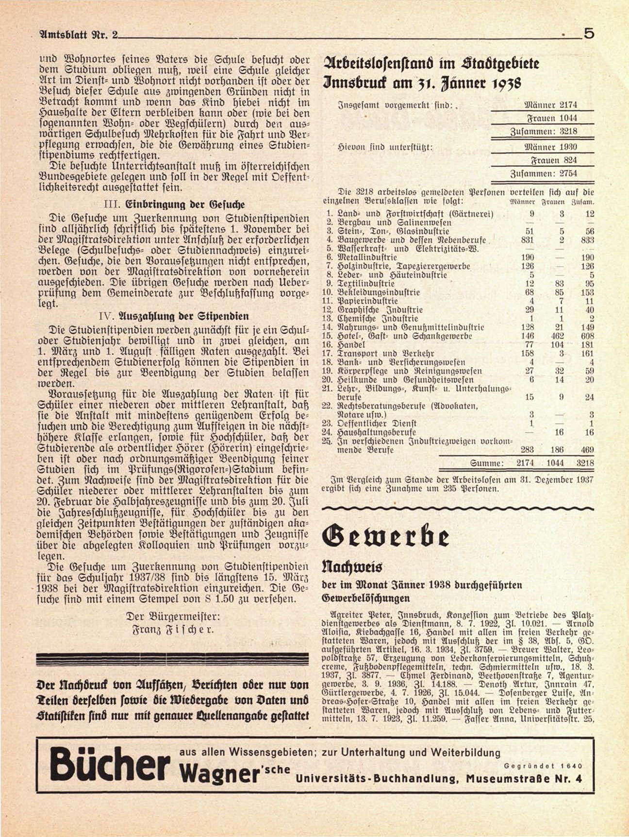 1937, Zl. 3877. — Chmel Ferdinand, Beethooenstraße 7, Agenturgewerbe. 3. 9. 1936. Zl. 14.188. — Denoth Artur, Innrain 47,
