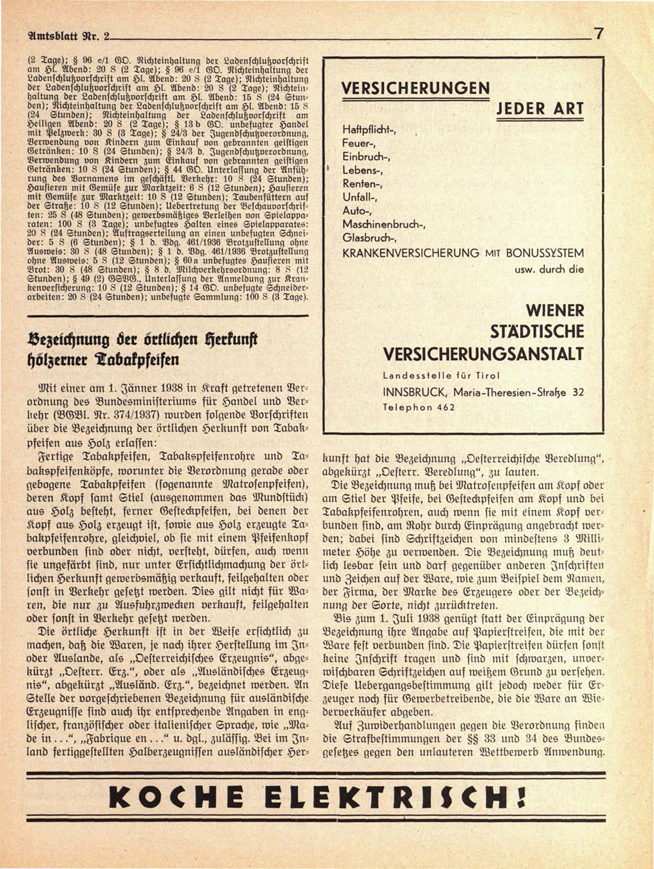 Mit einer am 1. Jänner 1938 in Kraft getretenen Verordnung des Bundesministeriums für Handel und Verkehr (BGBl. Nr. 374/1937) wurden folgende Vorschriften