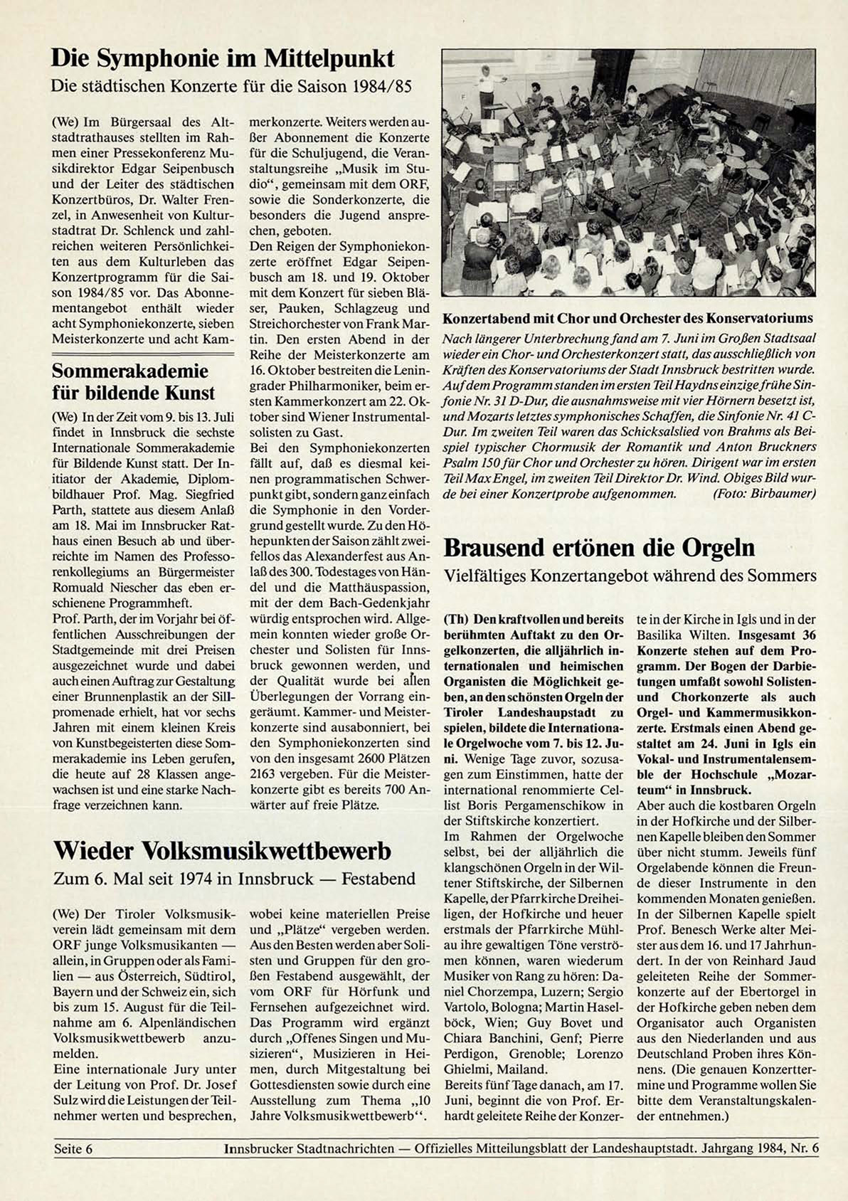 Innsbrucker Stadtnachrichten — Offizielles Mitteilungsblatt der Landeshauptstadt. Jahrgang 1984, Nr. 6