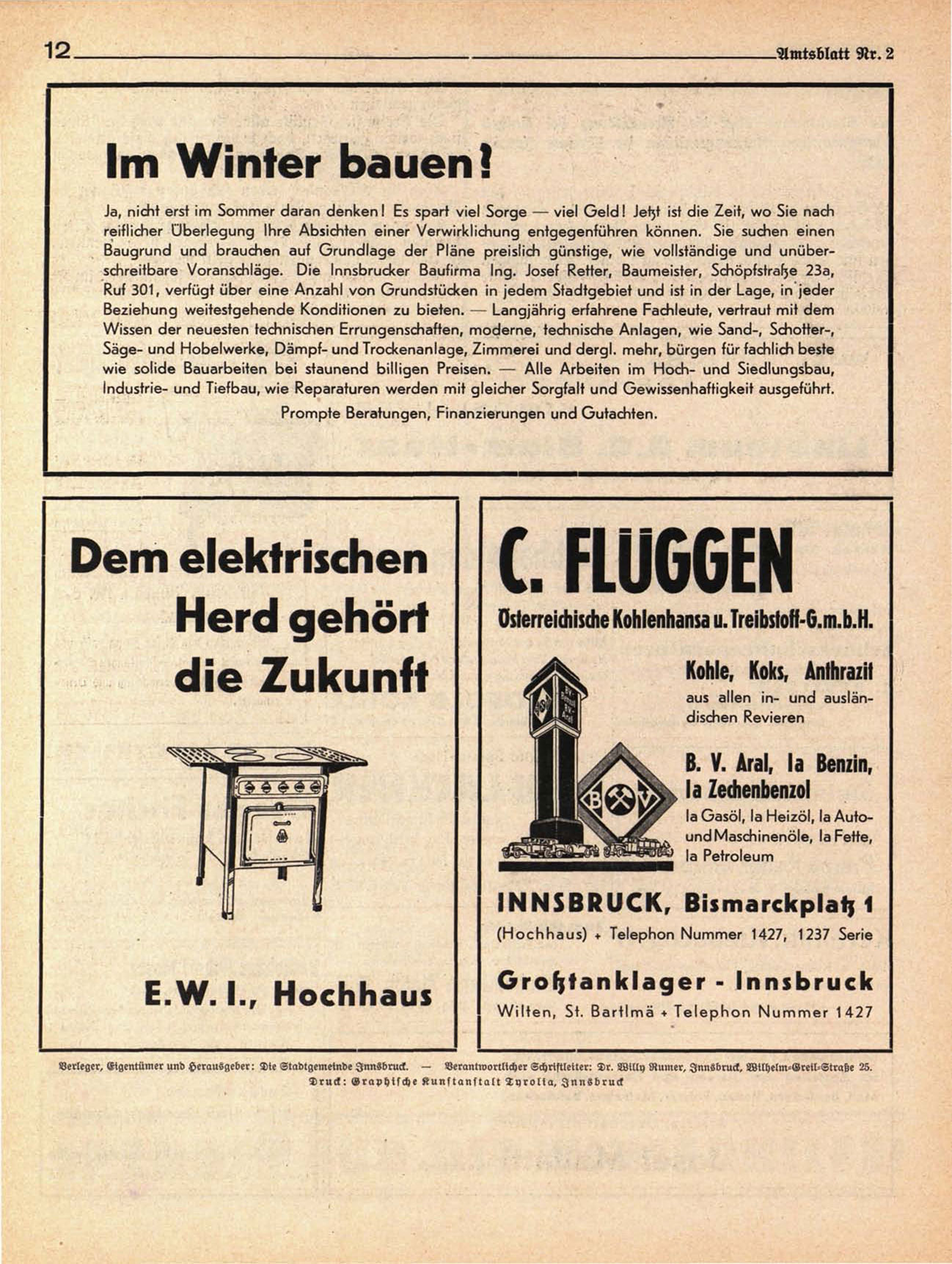 Verleger, Eigentümer und Herausgeber: Die Stadtgemeinde Innsbruck. — Verantwortlicher Schriftleiter: Nr. Willy Rumer, Innsbruck, Wilhelm-Vreil-Straße 25.