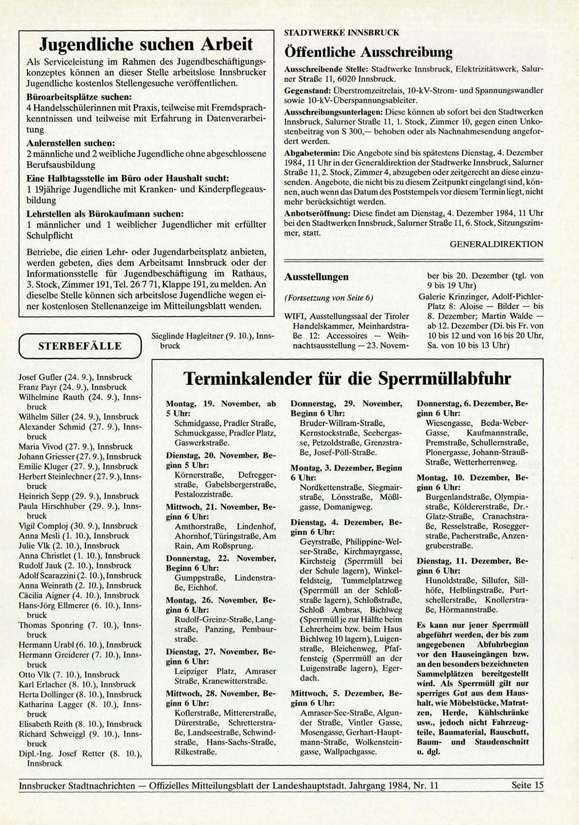 Innsbrucker Stadtnachrichten — Offizielles Mitteilungsblatt der Landeshauptstadt. Jahrgang 1984, Nr. 11