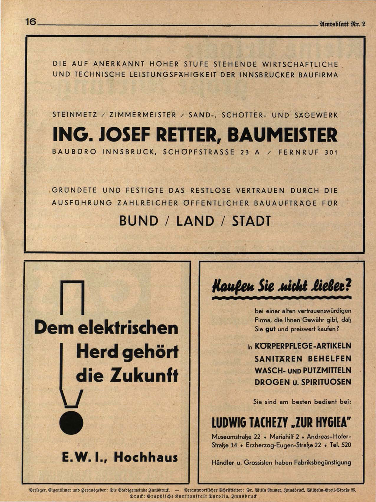 Verleger, Eigentümer und Herausgeber: Die Stadtgemetnde Innsbruck. — Verantwortlicher Schriftleiter: Dr. Willy Rumer, Innsbruck, Wilhelm-Vretl-Straße 25.