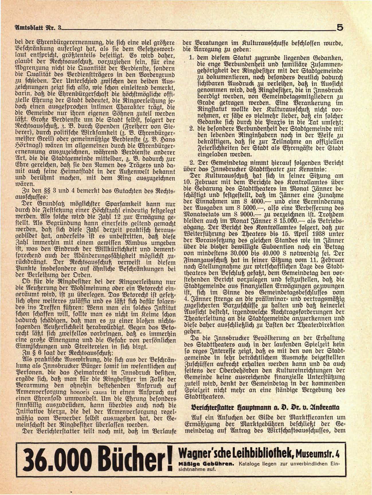Ehre gereichen, daß sie den Namen des Trägers und damit auch seine Heimatstadt in der Außenwelt bekannt über das Innsbrucker Stadttheater zur Kenntnis: