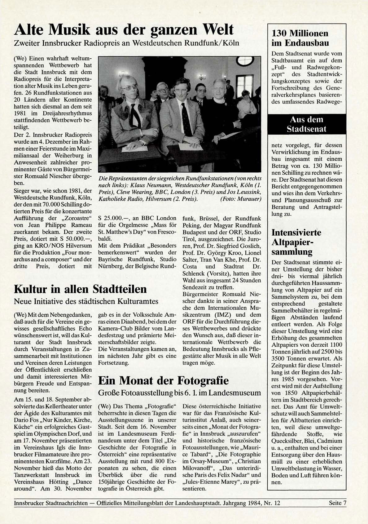 Innsbrucker Stadtnachrichten — Offizielles Mitteilungsblatt der Landeshauptstadt. Jahrgang 1984, Nr. 12