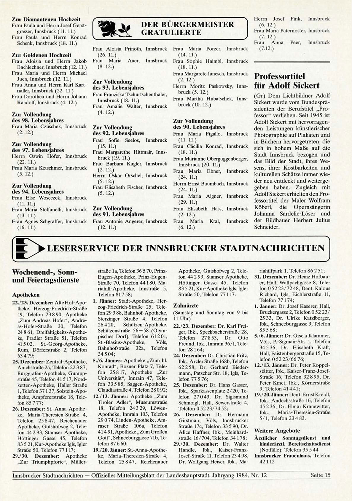 Innsbrucker Stadtnachrichten — Offizielles Mitteilungsblatt der Landeshauptstadt. Jahrgang 1984, Nr. 12