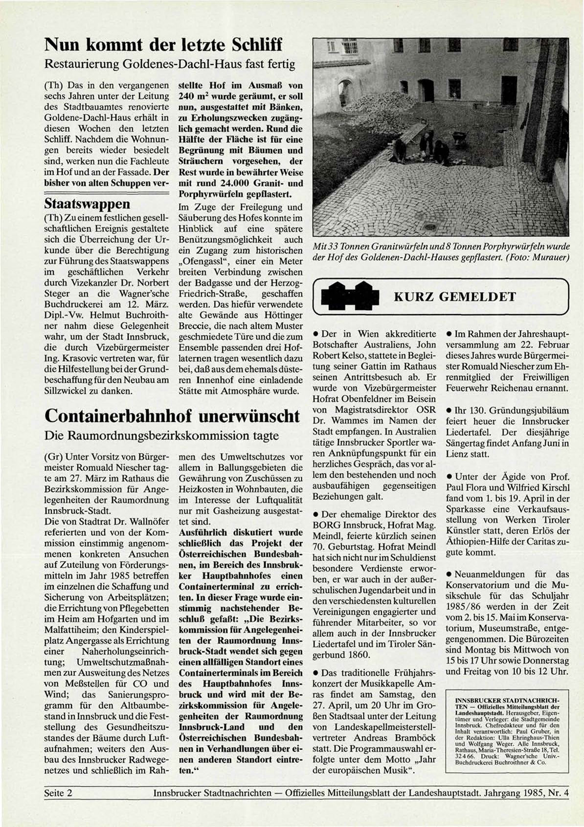 Innsbrucker Stadtnachrichten — Offizielles Mitteilungsblatt der Landeshauptstadt. Jahrgang 1985, Nr. 4