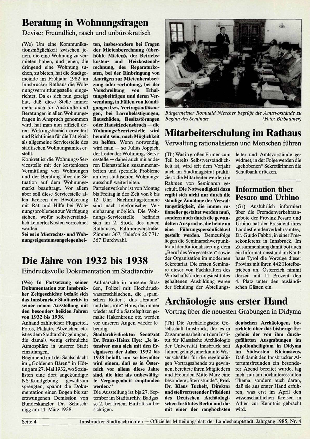 Innsbrucker Stadtnachrichten — Offizielles Mitteilungsblatt der Landeshauptstadt. Jahrgang 1985, Nr. 4