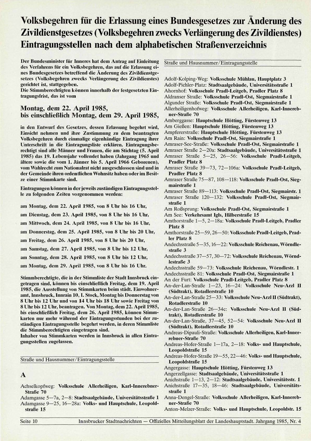 Innsbrucker Stadtnachrichten — Offizielles Mitteilungsblatt der Landeshauptstadt. Jahrgang 1985, Nr. 4