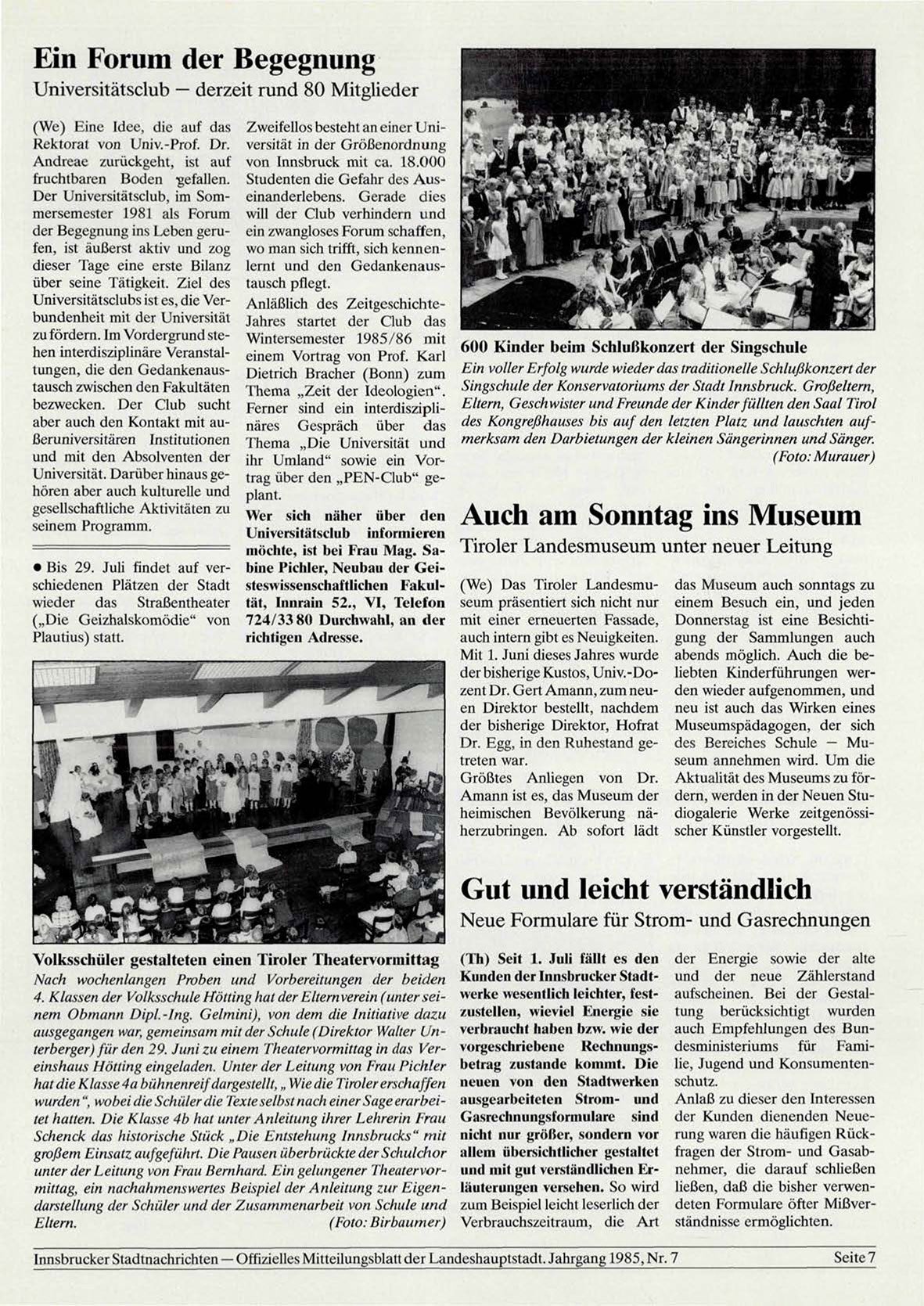 Innsbrucker Stadtnachrichten — Offizielles Mitteilungsblatt der Landeshauptstadt. Jahrgang 1985, Nr. 7