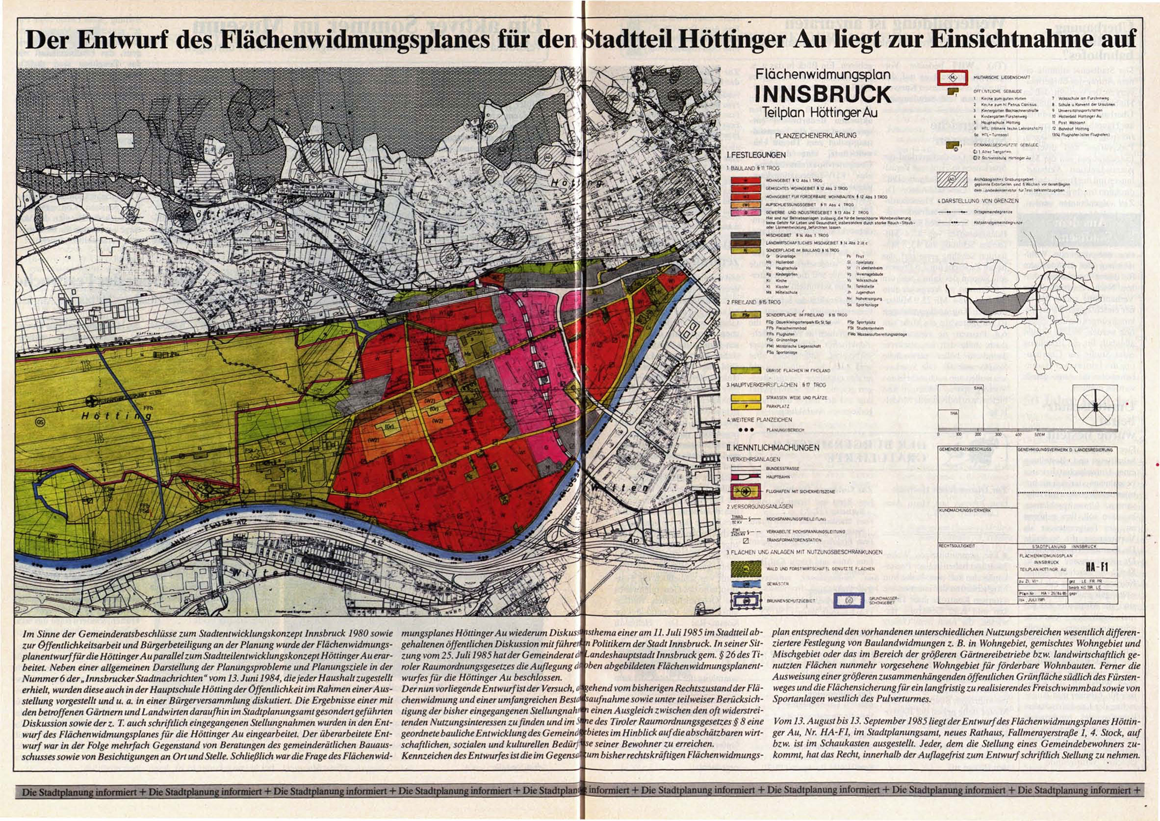 Im Sinne der Gemeinderatsbeschlüsse zum Stadtentwicklungskonzept Innsbruck 1980 sowie mun gsplanes Höttinger Au wiederum Diskus» isthema einer am :11Juli 1985 im Stadtteilab- plan entsprechend den vorhandenen unterschiedlichen Nutzungsbereichen wesentlich differenzur Öffentlichkeitsarbeit und Bürgerbeteiligung an der Planung wurde der Flächenwidmungs-gehaltenen öffentlichen Diskussion mitführet n Politikern der Stadt Innsbruck. In seiner Sit- ziertere Festlegung von Baulandwidmungen z. B. in Wohngebiet, gemischtes Wohngebiet und