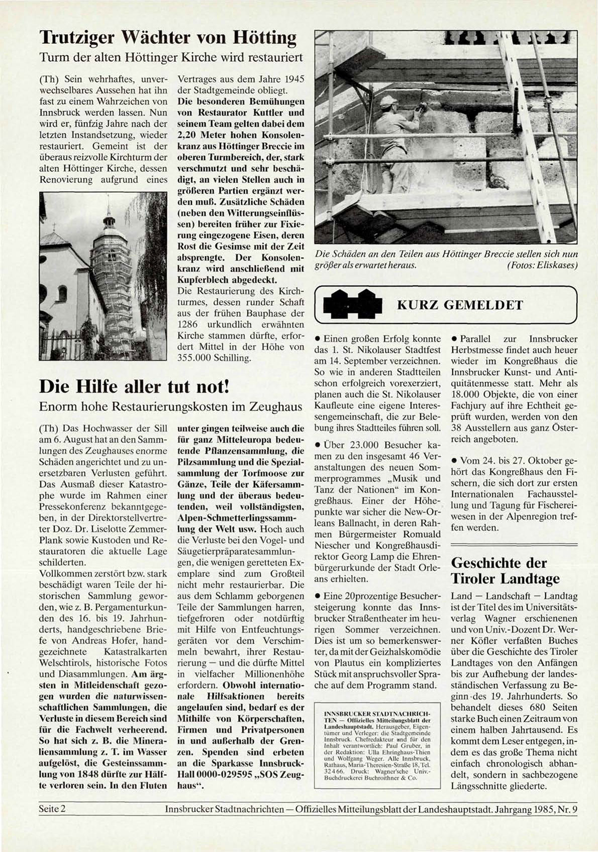 Innsbrucker Stadtnachrichten — Offizielles Mitteilungsblatt der Landeshauptstadt. Jahrgang 1985, Nr. 9