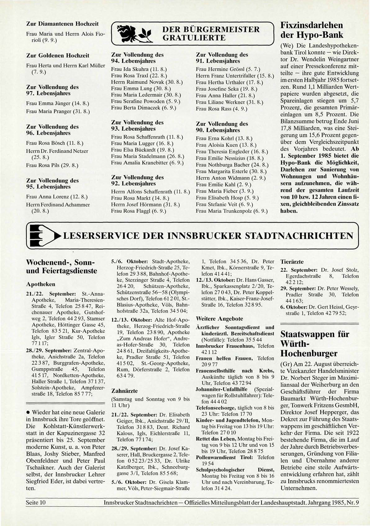 Innsbrucker Stadtnachrichten — Offizielles Mitteilungsblatt der Landeshauptstadt. Jahrgang 1985, Nr. 9