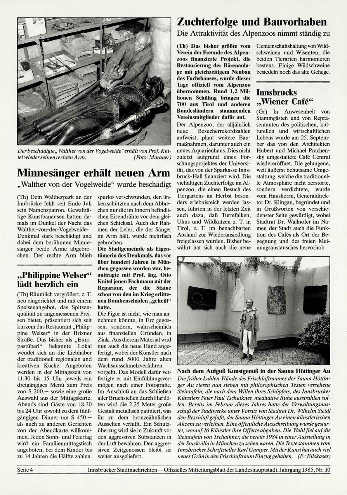 mals im Dunkel der Nacht das chen Schicksal. Auch der Rah- Uhus und Wildkatzen z. T. in Stadtrat Dr. Wallnöfer im NaWalther-von-der-Vogelweidemen der Leier, die der Sänger Tirol, z. T. im benachbarten men der Stadt auch die FunkDenkmal stark beschädigt und im Arm hält, wurde mehrfach Ausland zur Wiederansiedlung tion des Cafes als Ort der Befreigelassen wurden. Bisher be- gegnung und des freien Meidabei dem berühmten Minne- gebrochen.