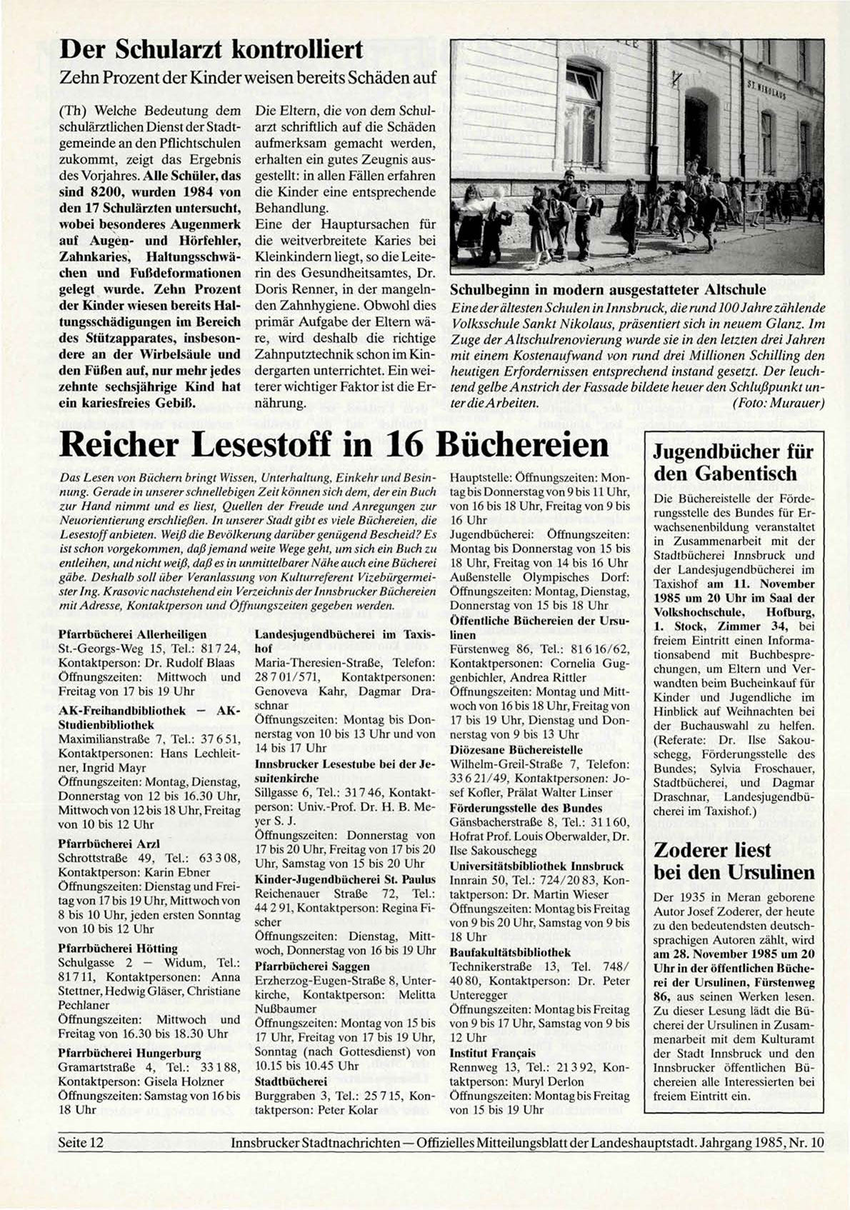 gäbe. Deshalb soll über Veranlassung von Kulturreferent Vizebürgermeister Ing. Krasovic nachstehend ein Verzeichnis der Innsbrucker BüchereienÖffnungszeiten: Montag, Dienstag,