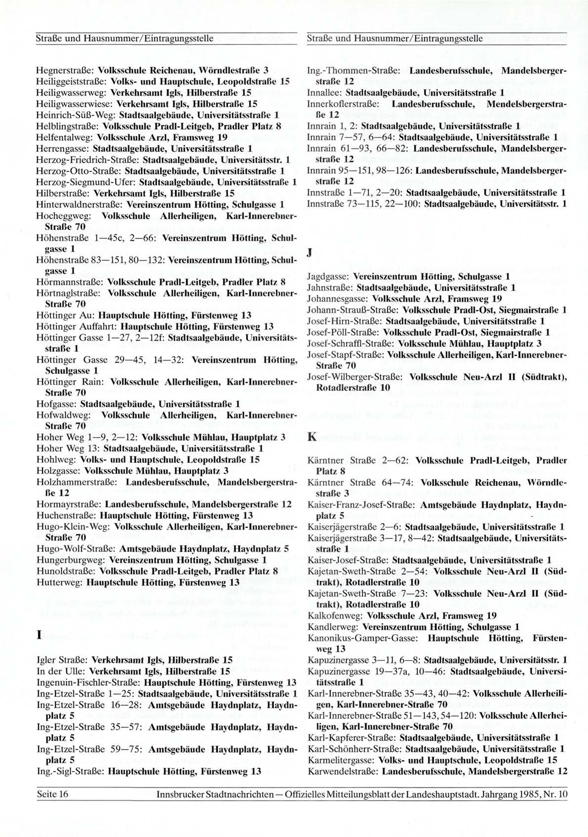 Innsbrucker Stadtnachrichten — Offizielles Mitteilungsblatt der Landeshauptstadt. Jahrgang 1985, Nr. 10