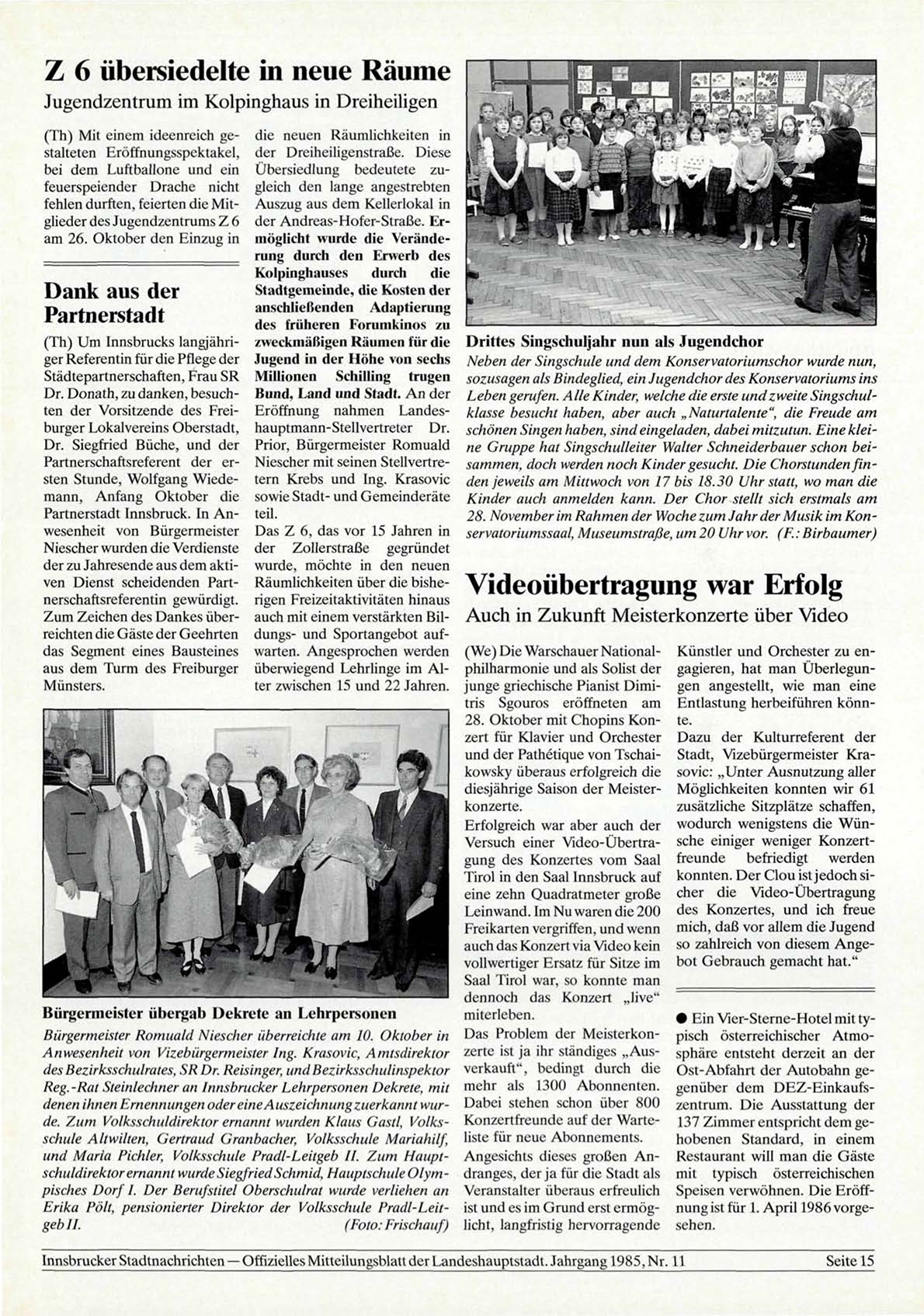 Innsbrucker Stadtnachrichten — Offizielles Mitteilungsblatt der Landeshauptstadt. Jahrgang 1985, Nr. 11