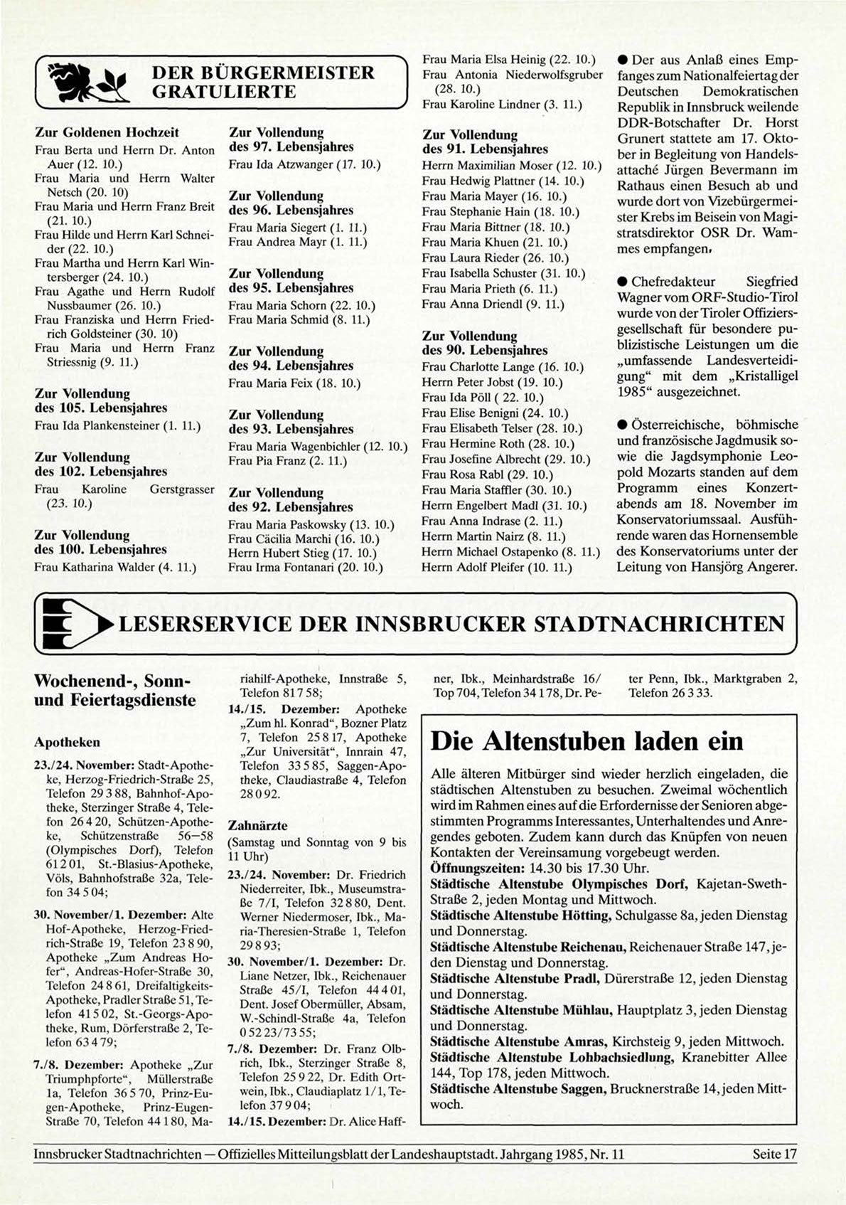 Innsbrucker Stadtnachrichten — Offizielles Mitteilungsblatt der Landeshauptstadt. Jahrgang 1985, Nr. 11