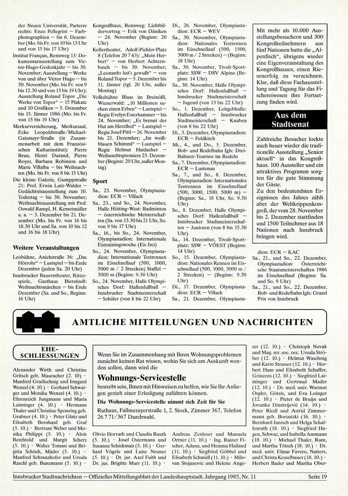 Innsbrucker Stadtnachrichten — Offizielles Mitteilungsblatt der Landeshauptstadt. Jahrgang 1985, Nr. 11
