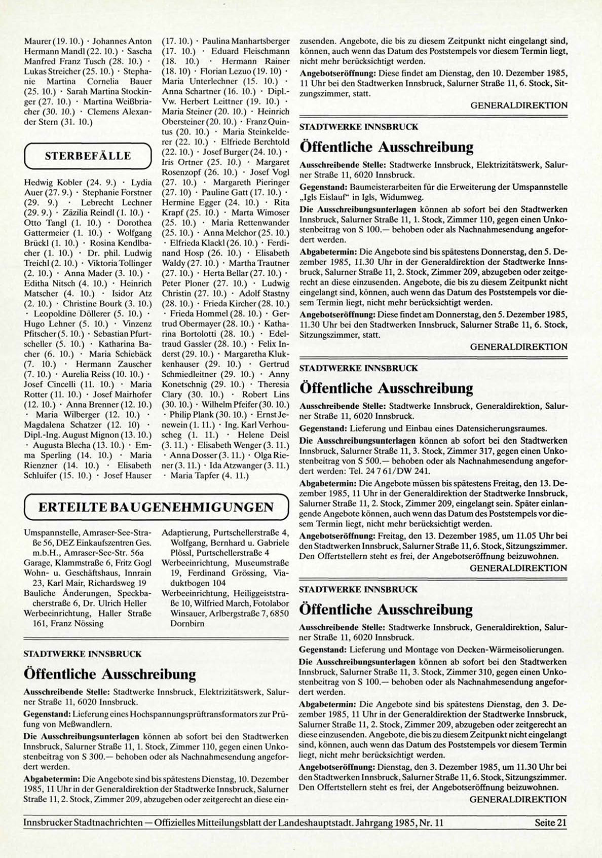 Abgabetermin: Die Angebote müssen bis spätestens Freitag, den 13. Dezember 1985, 11 Uhr in der Generaldirektion der Stadtwerke Innsbruck,