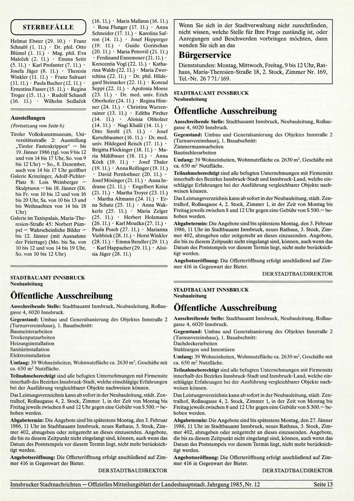 Innsbrucker Stadtnachrichten — Offizielles Mitteilungsblatt der Landeshauptstadt. Jahrgang 1985, Nr. 12
