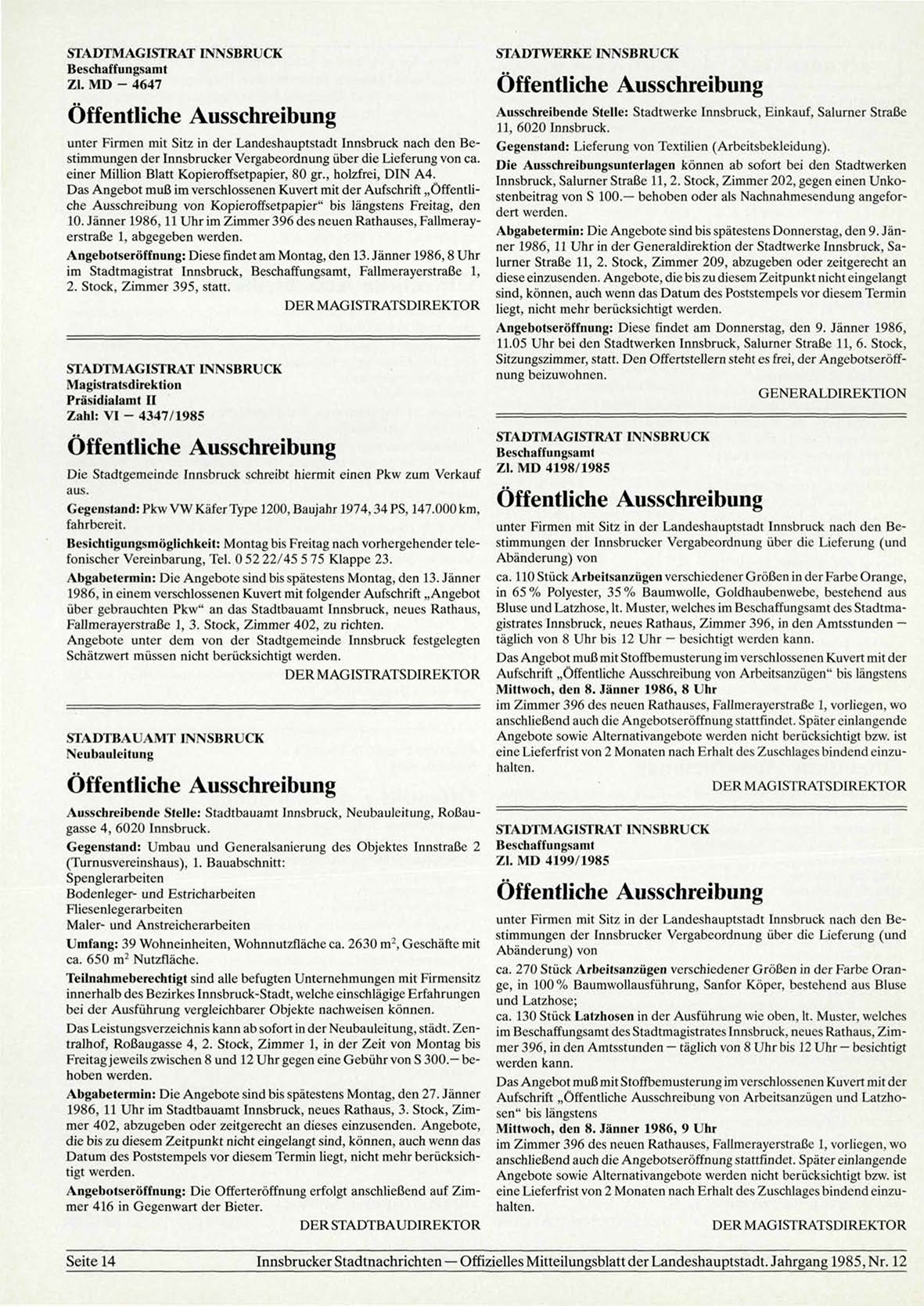 ner 1986, 11 Uhr in der Generaldirektion der Stadtwerke Innsbruck, SaAngebotseröffnung: Diese findet am Montag, den 13. Jänner 1986,8 Uhr lurner Straße 11, 2. Stock, Zimmer 209, abzugeben oder zeitgerecht an