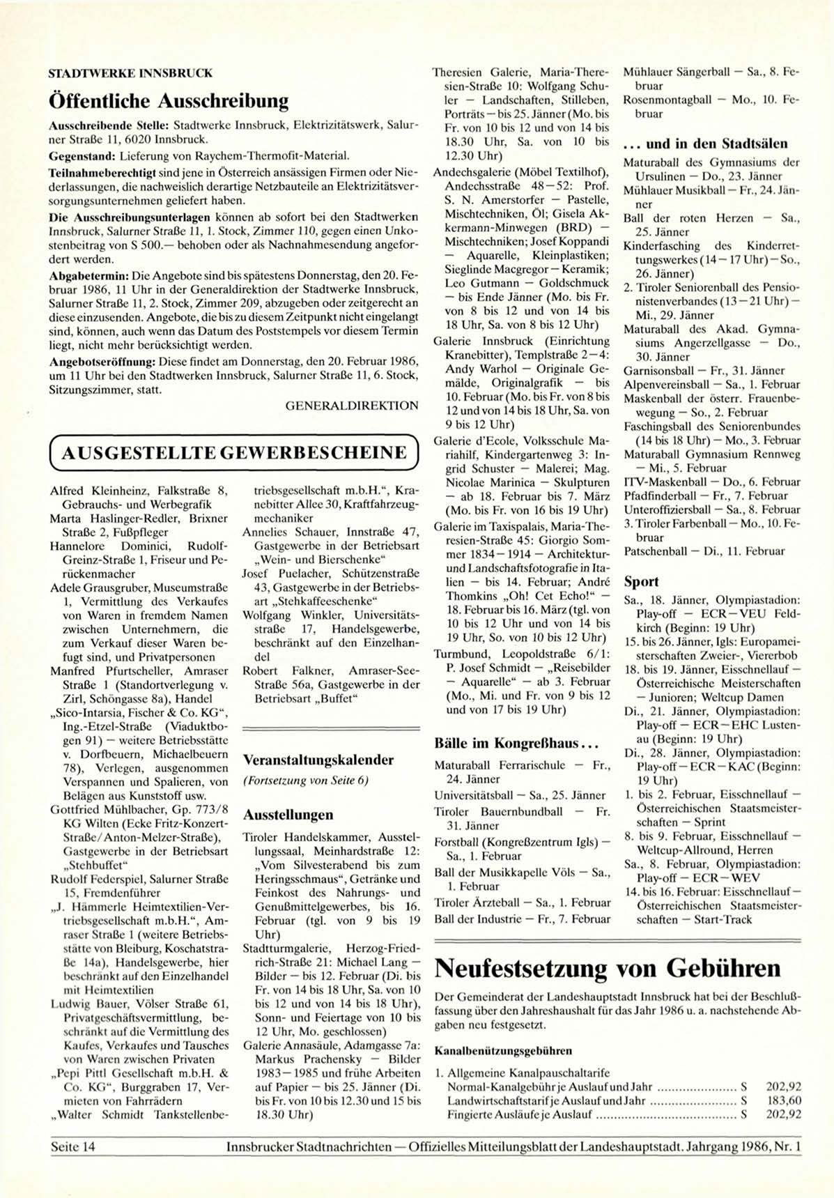Innsbrucker Stadtnachrichten — Offizielles Mitteilungsblatt der Landeshauptstadt. Jahrgang 1986, Nr. 1