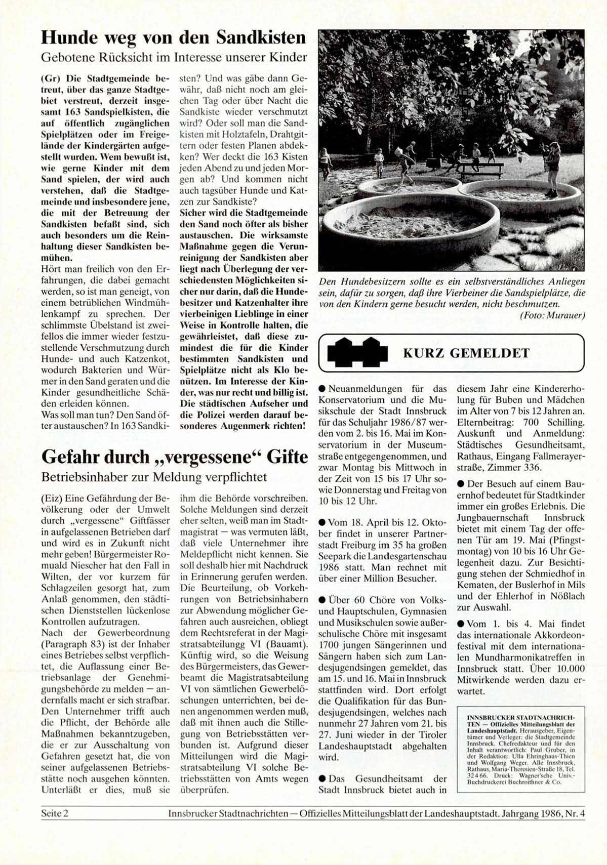 Innsbrucker Stadtnachrichten — Offizielles Mitteilungsblatt der Landeshauptstadt. Jahrgang 1986, Nr. 4